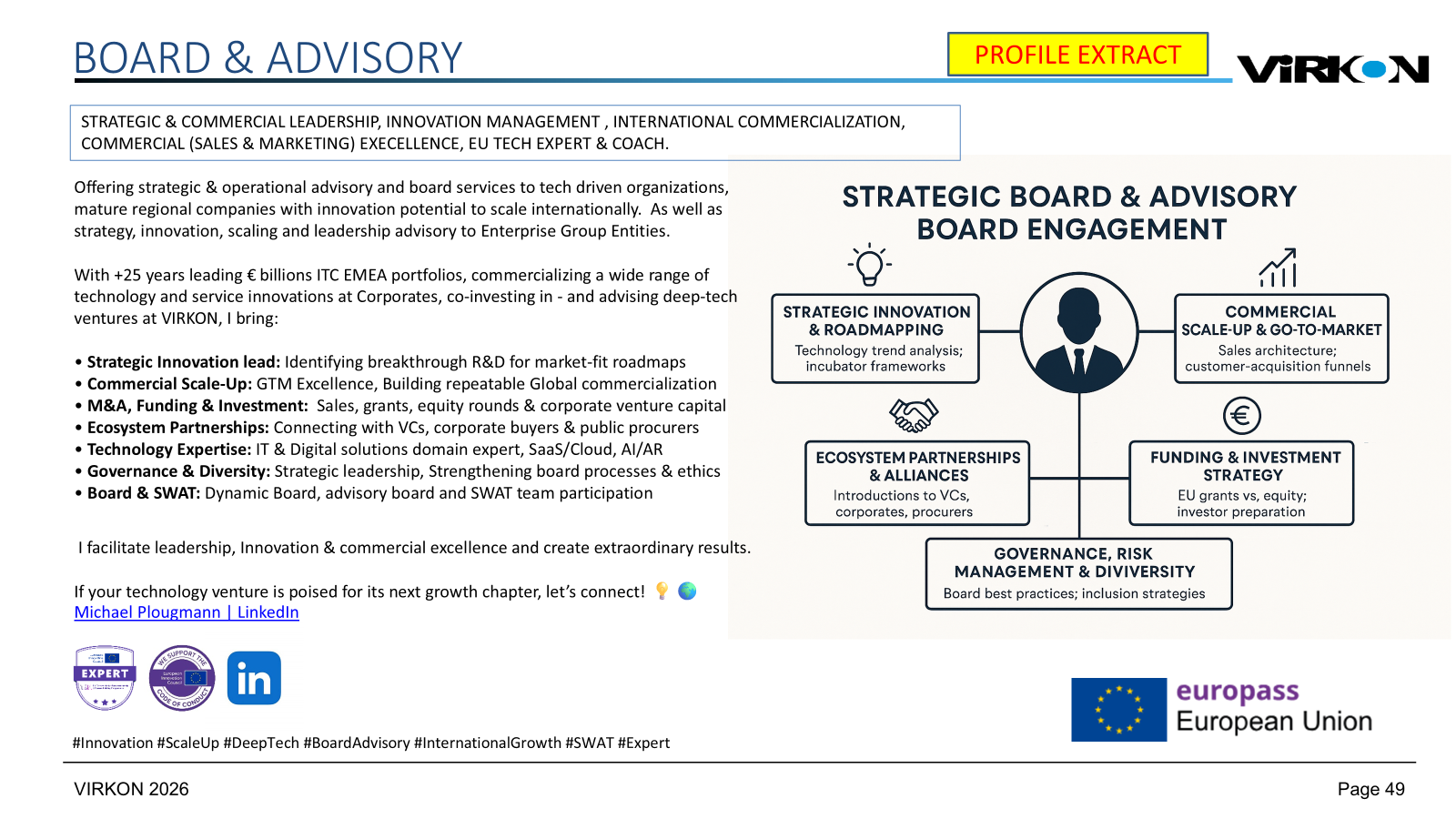 Strategic commercialization, Digitalization, Innovation Management & Sales excellence mip@virkon.dk +45 20254812 LinkedIn